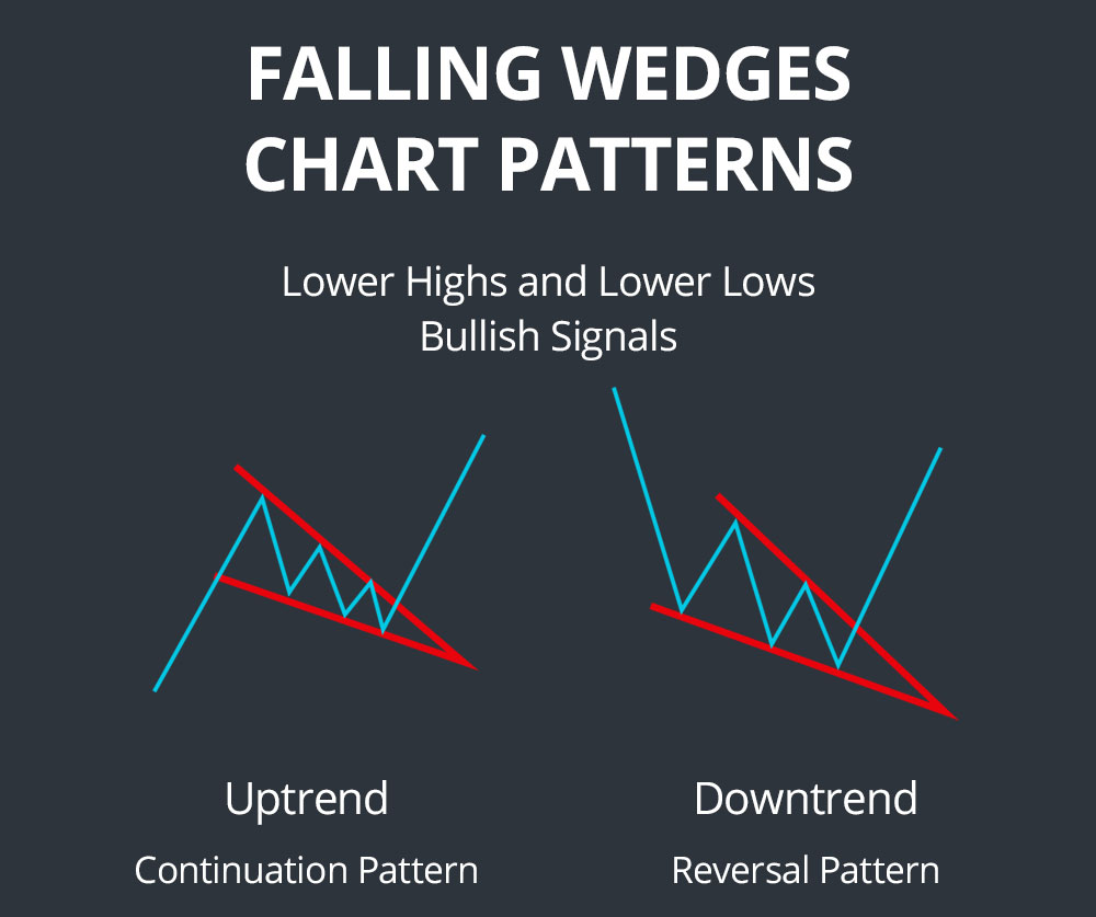 Falling wedges are the inverse of rising wedges and are always considered bullish signals. They develop when a narrowing trading range has a downward slope, such that subsequent lows and subsequent highs within the wedge are falling as trading progresses.