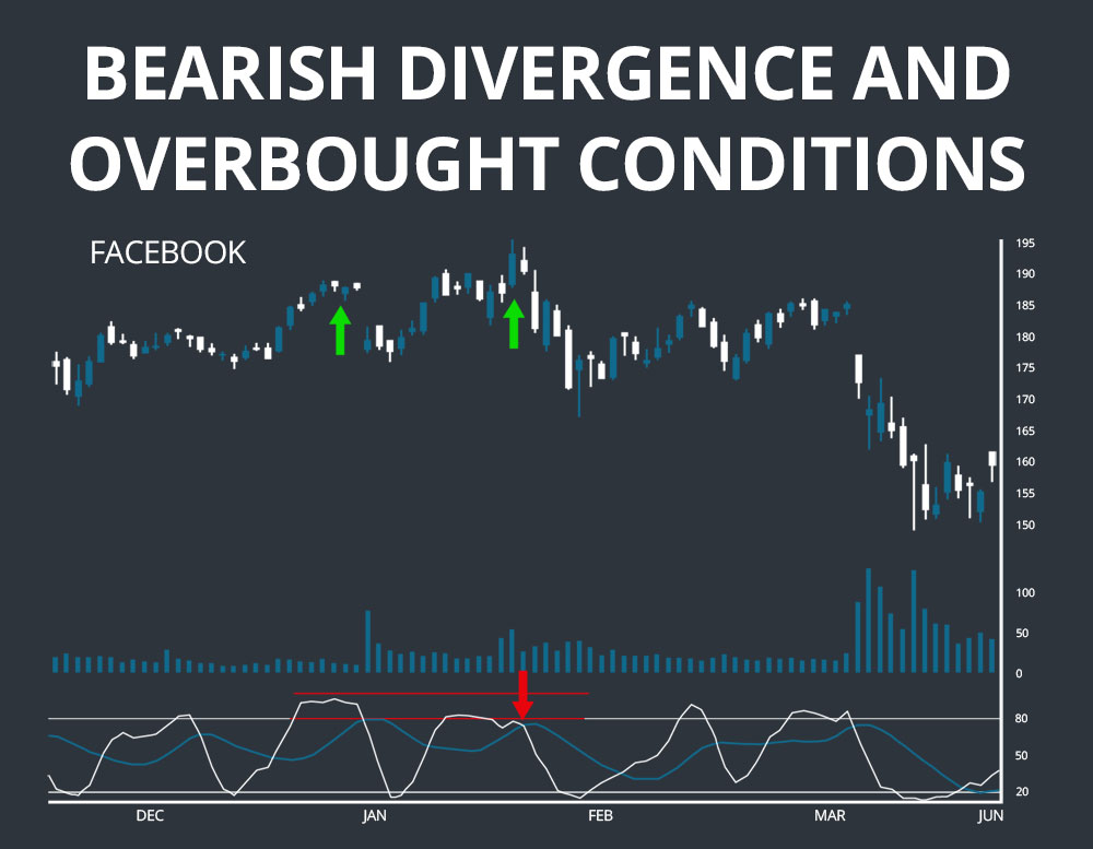 The first example shows a bearish divergence in the stochastic oscillator. The price of Facebook (FB) reaches a high on January 11 before falling, rebounding, and posting a higher high on February 1. However, the stochastic oscillator has posted a lower high on February 1 than on January 11, establishing a divergence. This divergence is further supported by the fact that the stochastic oscillator is above 80, indicating overbought conditions. As the divergence predicts, the bullish trend reverses sharply after February 1.