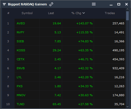 AVEO, NVFY, SIEB, KOSS, CETX, ENVB, LYL, PXS, MINOV, TLND