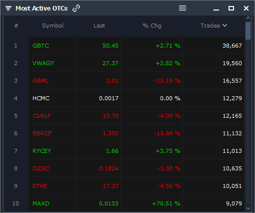 GBTC, VWAGY, ABML, HCMC, CURLF, BBKCF, RYCEY, OZSC, ETHE, MAXD
