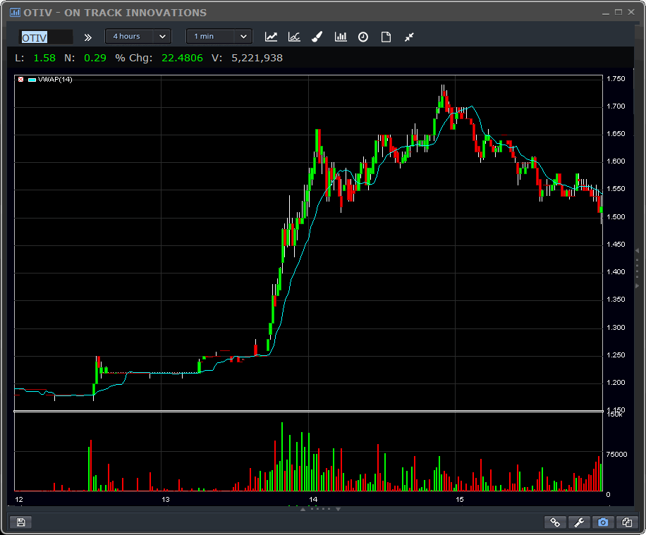 As an example, check out the daily chart on ticker symbol OTIV below. This stock was the “flavor of the day” in pre-market, having put out early positive news. However, the markets opened down, leaving traders reluctant to jump in with buy orders and resulting in sideways movement for the first 4 hours of the trading day.