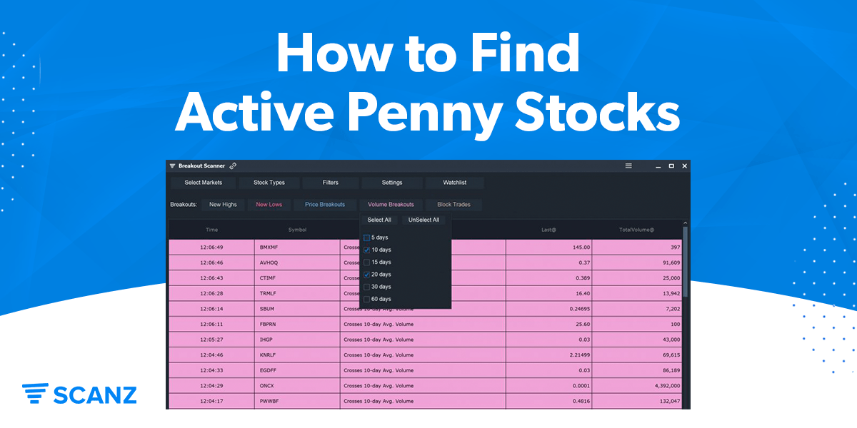 You can also use the Breakout Scanner to quickly spot penny stocks experiencing higher than average trading volume. Choose OTC as your market to scan, then add a volume filter to find stocks that are crossing above a moving average of their daily trading volume. You may also want to add a filter for Current Trades or Current $Volume to eliminate stocks that typically trade with low liquidity.