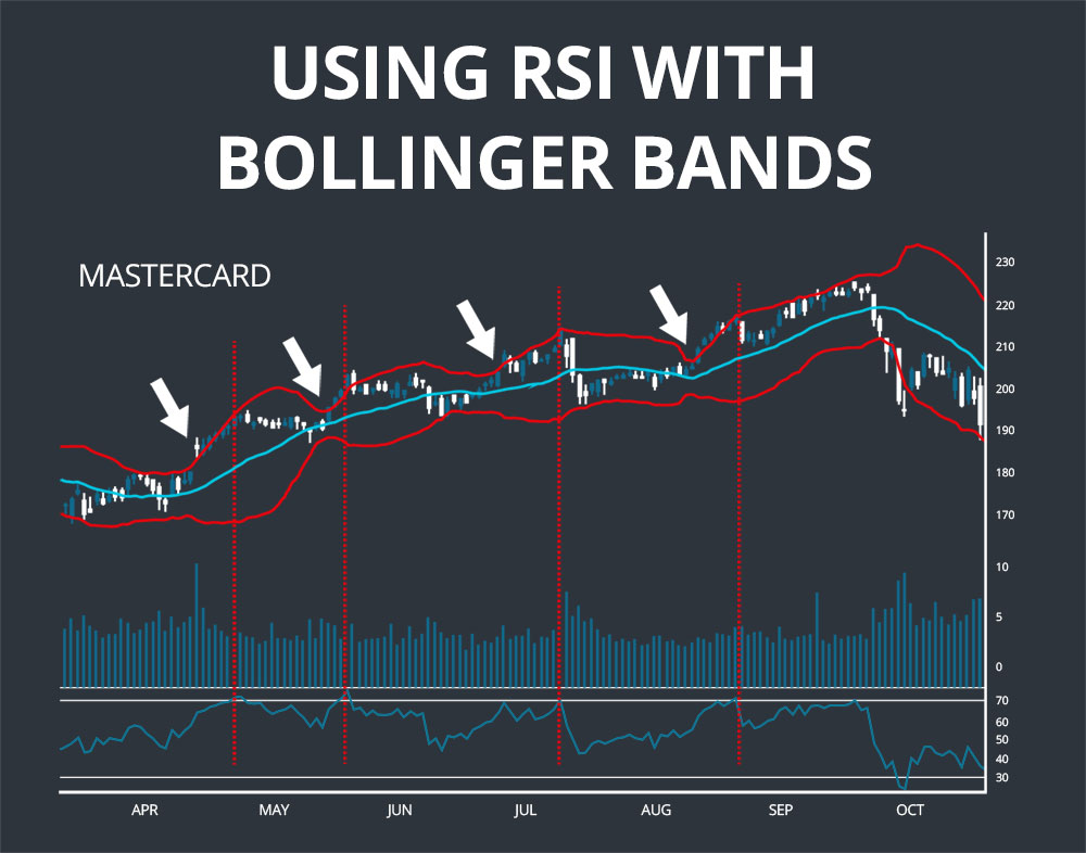 In cases when a stock is moving strongly bullishly or bearishly, the price can also “walk the bands” – that is, repeatedly touch or mildly break either the upper or lower band. In the case of walking the upper band, this is typically a sign of strength since it takes significant strength to continue to push this resistance level, even if in other conditions the stock would be considered overbought. The converse is true for walking the lower band. In this case, it is important to check other indicators, especially the RSI, to identify when buying and selling opportunities will occur as the stock price repeatedly rebounds off of one of the bands.