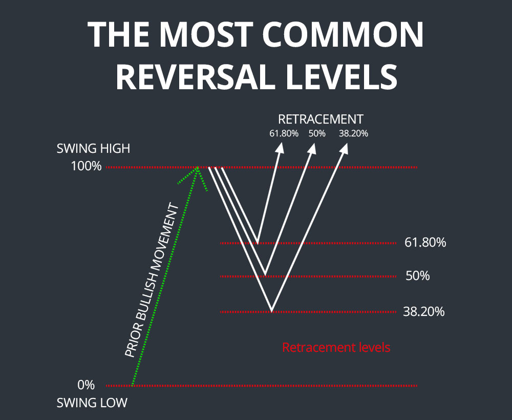 Once you have drawn a set of Fibonacci retracements on a chart, it is possible to anticipate potential reversal points where support or resistance will be encountered. If the retracements are based on a bullish movement, the retracements should indicate potential support levels where a downtrend will reverse bullishly. If the retracements are based on a bearish movement, the retracements should indicate potential resistance levels where a rebound will be reversed bearishly.