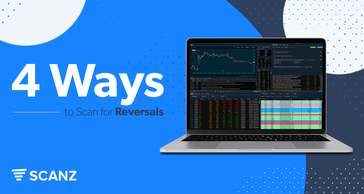 Finding reversals can be tricky, as it requires some detective work. That research starts with scanning for stocks that could potentially be signaling a reversal, but also requires searching for specific technical signals that could anticipate a trend shift. In this article, we’ll explore four different scans you can create with the Scanz Pro Scanner module to identify stocks that are poised for a reversal.