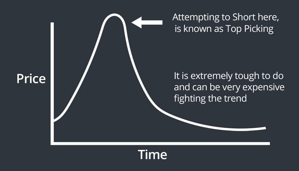 fundamental value that overextend on daily charts are favorites amongst traders. Below are a few setups over the past few weeks that have caught the eye of many short sellers. It is extremely tough to short a stock that is just going parabolic, known as “top picking.” It’s good practice to wait for confirmation that a trend has reversed before jumping in blindly.