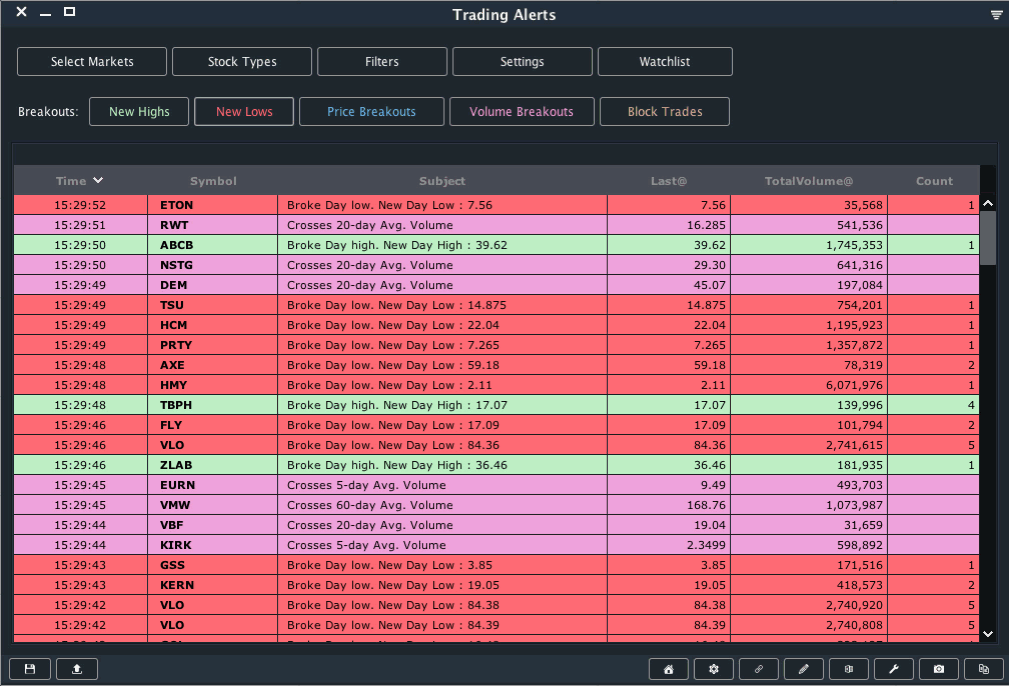 Get notified of stocks making new highs or lows, breaking out of price or volume ranges, and our "one of a kind" block trade signals.